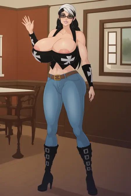 ➜ TildaVonTitantanksMFGXL, mature female, pink lips, black eyes, black hair, white hair, multicolored hair, long hair, sidelocks, white bandana, black sunglasses, huge breasts, bare shoulders, cleavage, areola slip, black midriff, black detached sleeves, brown belt, denim pants, black boots