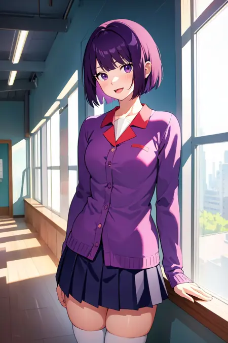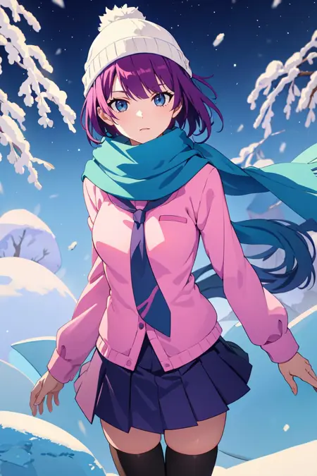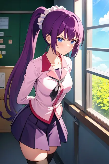 그녀를 불러오려면 다음 태그와 함께 트리거 태그를 사용하세요: solo, 자주색 머리, 긴 머리, 파란 눈, 가슴, 관객을 바라보는 표정, 보통 크기의 가슴, 앞머리, 나오에تس 고등학교 복장, 치마, 무릎 양말, 셔츠, 긴 소매