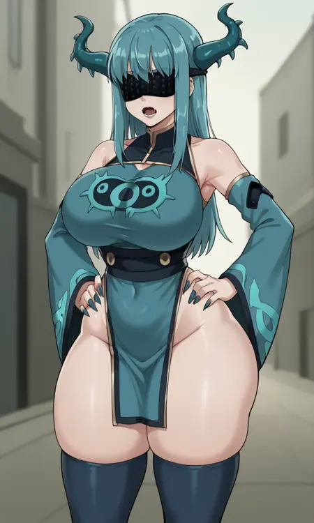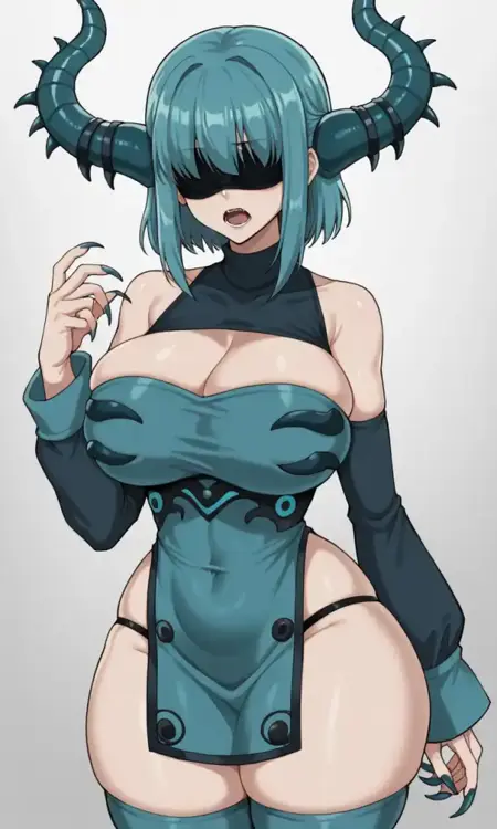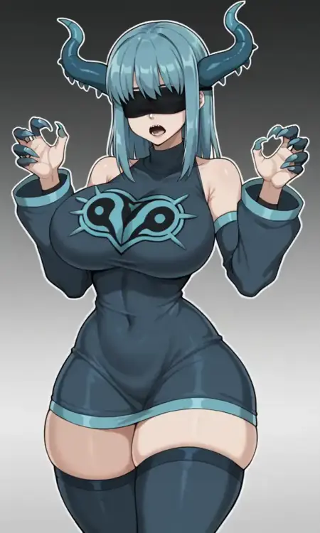 | Trained Words | Warden, 1girl, warden, horns, blue horns, pale skin, moss, blue pattern, ribcage, blue hair, hair over eyes, open mouth, blindfold, dark blue stockings, two-tone dress, dark blue dress, sleeveless, turtleneck, detached sleeves, long dark blue sleeves, sleeves past wrists, claws, sparkly hair, sparkly dressCopied! |