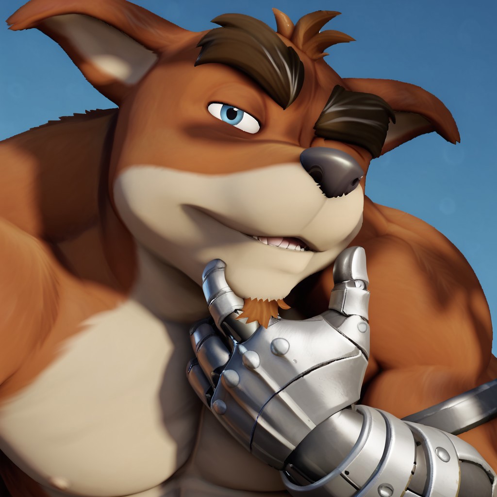 CrunchB, 1boy, anthro, orange fur, blue eyes, thick eyebrows, black nose, beige muzzle, orange goatee, left arm metal shoulder bracelet, right metal arm