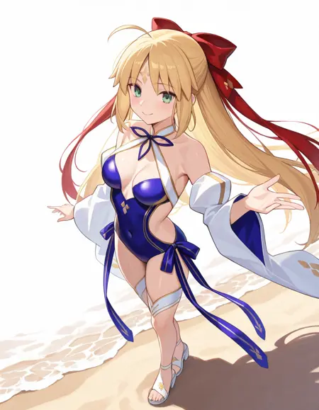 AAA, AAA_one-piece_swimsuit, AAA_detached_sleeves, AAA_hair_ribbon, red hair ribbon