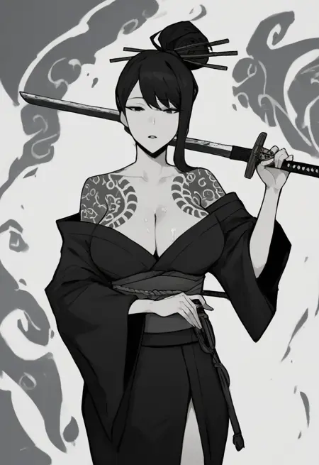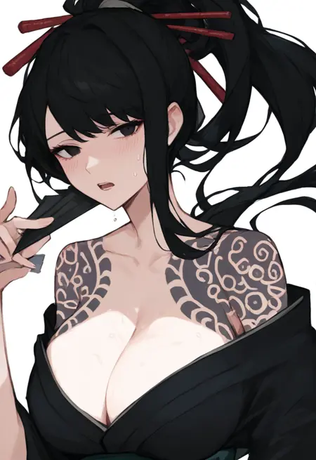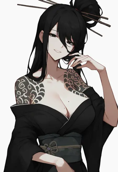 tattoo on body, black hair, hair stick, single hair bun, black eyes