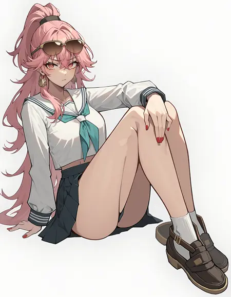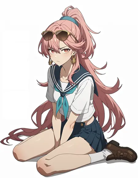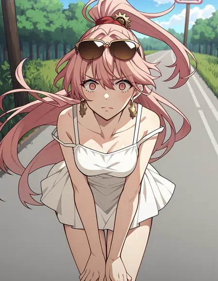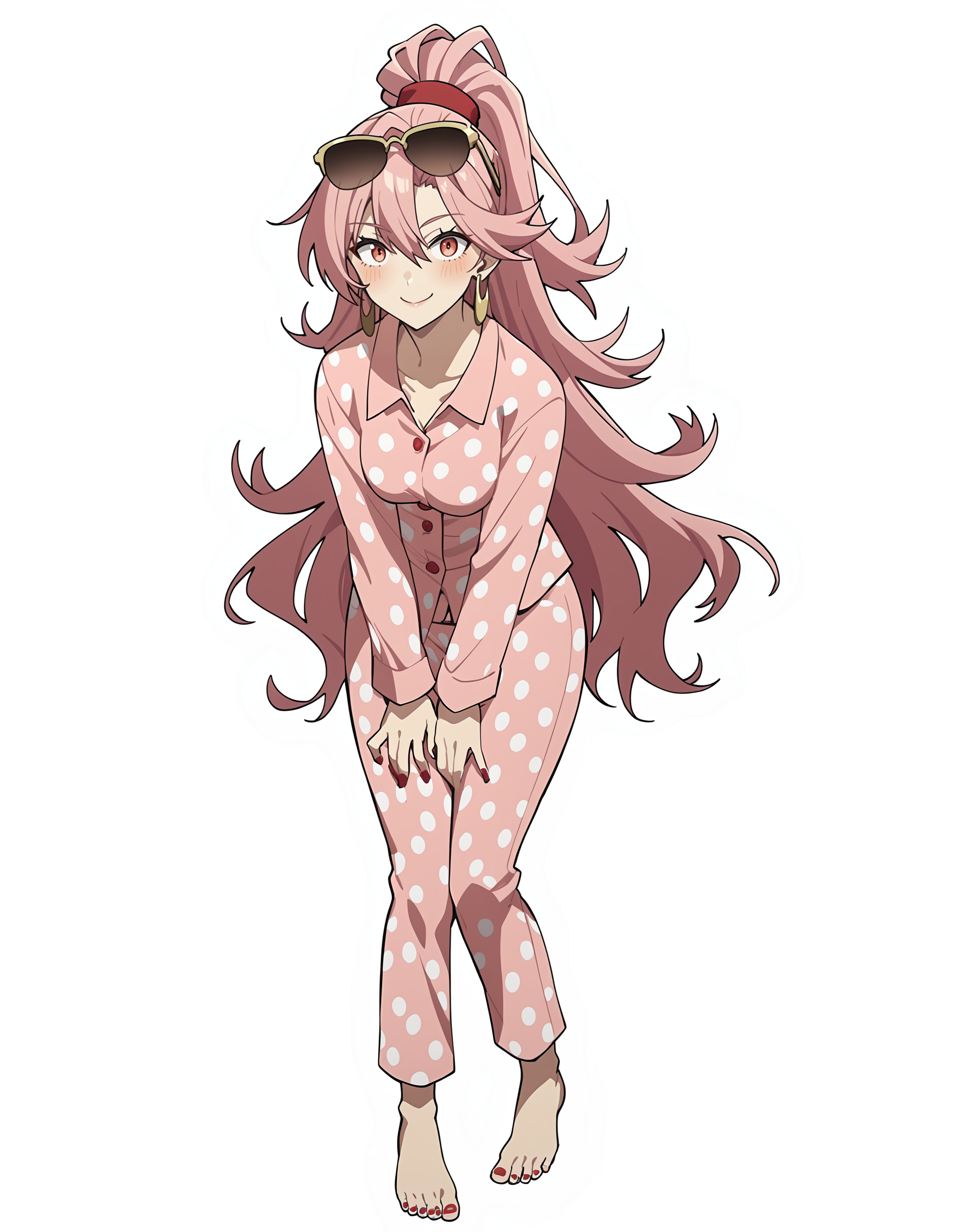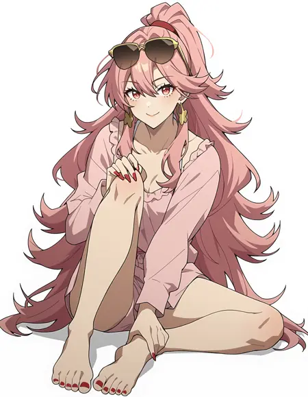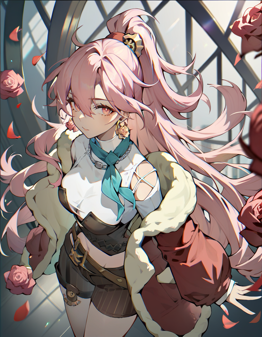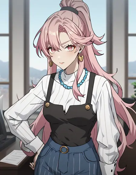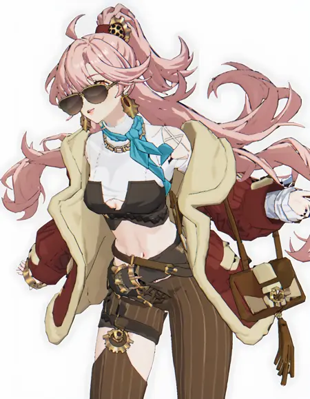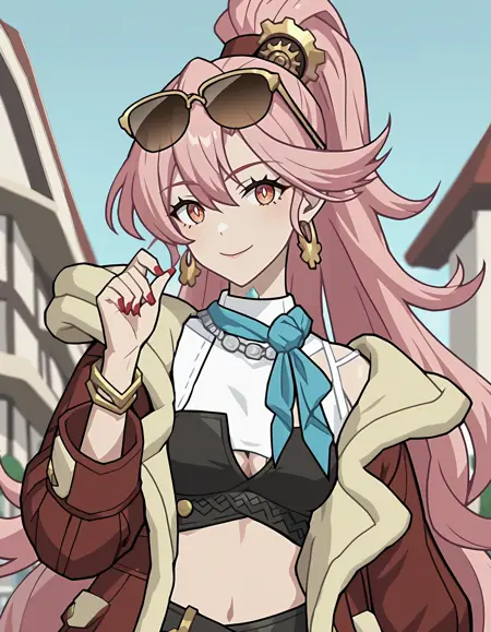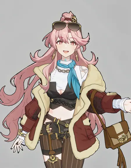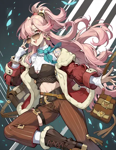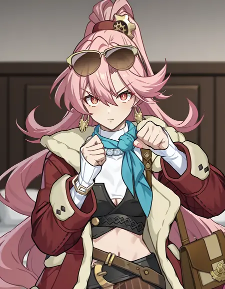 jialifu,1girl,solo,eyewear on head,long hair,pink hair,sunglasses,jewelry,earrings,navel,bag,belt,long sleeves,red eyes,fur trim,bangs,striped,ponytail,midriff,jacket,hair between eyes,