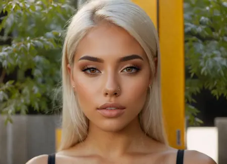 cinematic photo Sandy(shoulder long straight platinum blonde hair:1.2),Light Brown eyes, smoky makeup look, piercing on left side her nose, medium sized breasts) . 35mm photograph, film, bokeh, professional, 4k, highly detailed