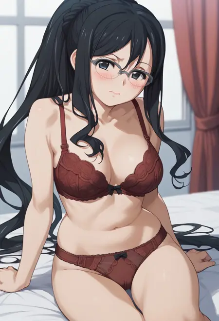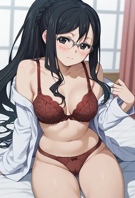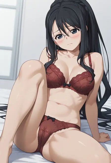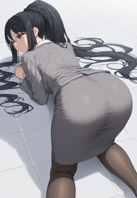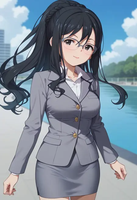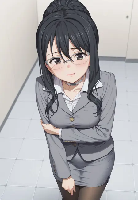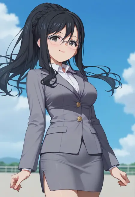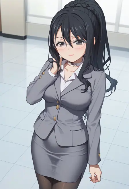 デフォルトの衣装:眼鏡、ポニーテール、グレーのジャケット、鉛筆スカート、グレーのスカート、長袖、パンスト(+白いチョーカー)