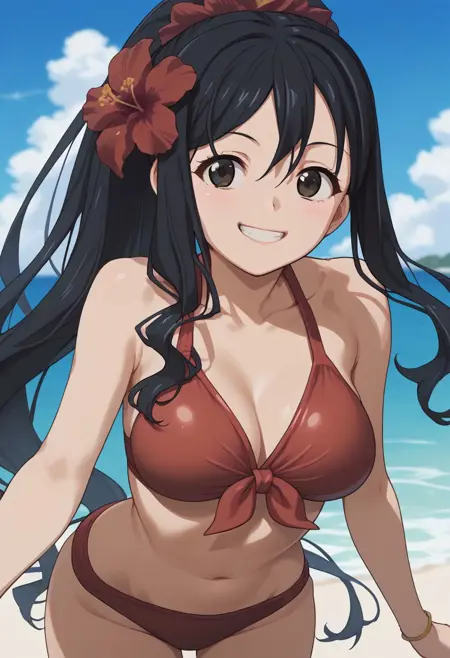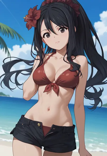 水着:ポニーテール、髪飾り、赤い花、赤いビキニ、黒のショートパンツ、フロントタイのビキニトップ、ショートパンツの下にビキニ