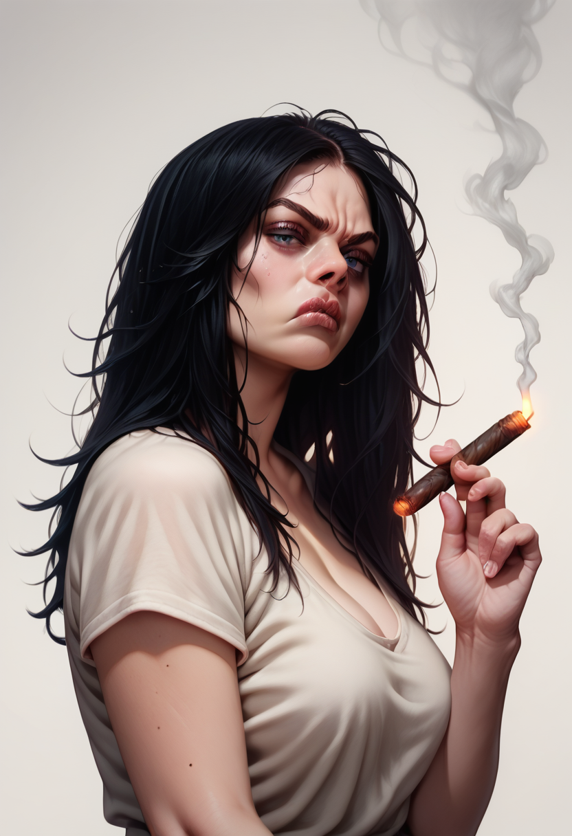 In an attempt to get a consistent character, I decided to figure out how to train a LoRA. In short, she's a pretty gal with sleepy eyes, stocky and tough, who smokes to many cigars, but I -think- I left them out of the training data, if not, I apologize.