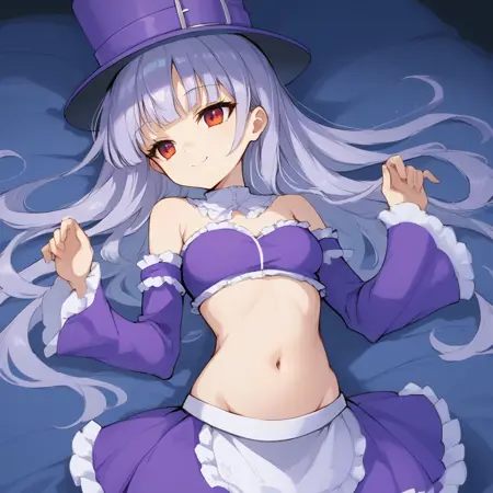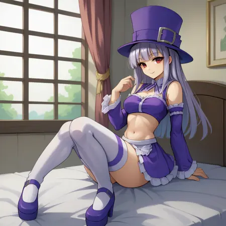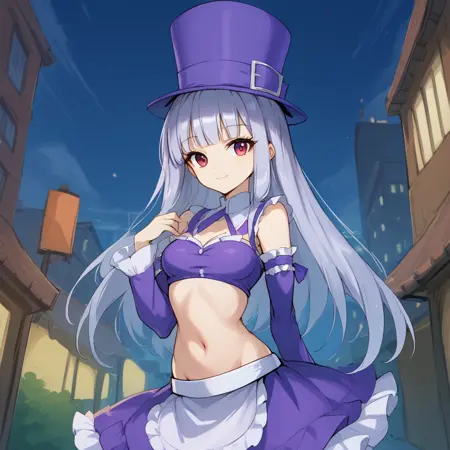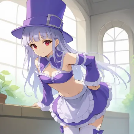 purple top hat, purple mary janes, purple frilled miniskirt, purple crop top, purple long detached sleeves, BREAK white thighhighs, waist apron