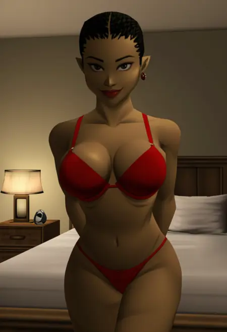 프린세스 루토: zora, purple eyes, earrings, colored skin, medium breasts, no nipples, smile