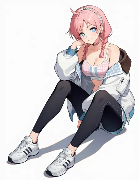 Azureus_SB,long sleeves, navel, cleavage, bare shoulders, jewelry, collarbone, earrings, open clothes, choker, midriff, off shoulder, open jacket, crop top, short shorts, spaghetti strap, legwear under shorts, pink choker, SB_jacket, SB_hairband, SB_sports_bra, SB_pants, SB_shorts, SB_leggings