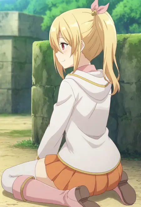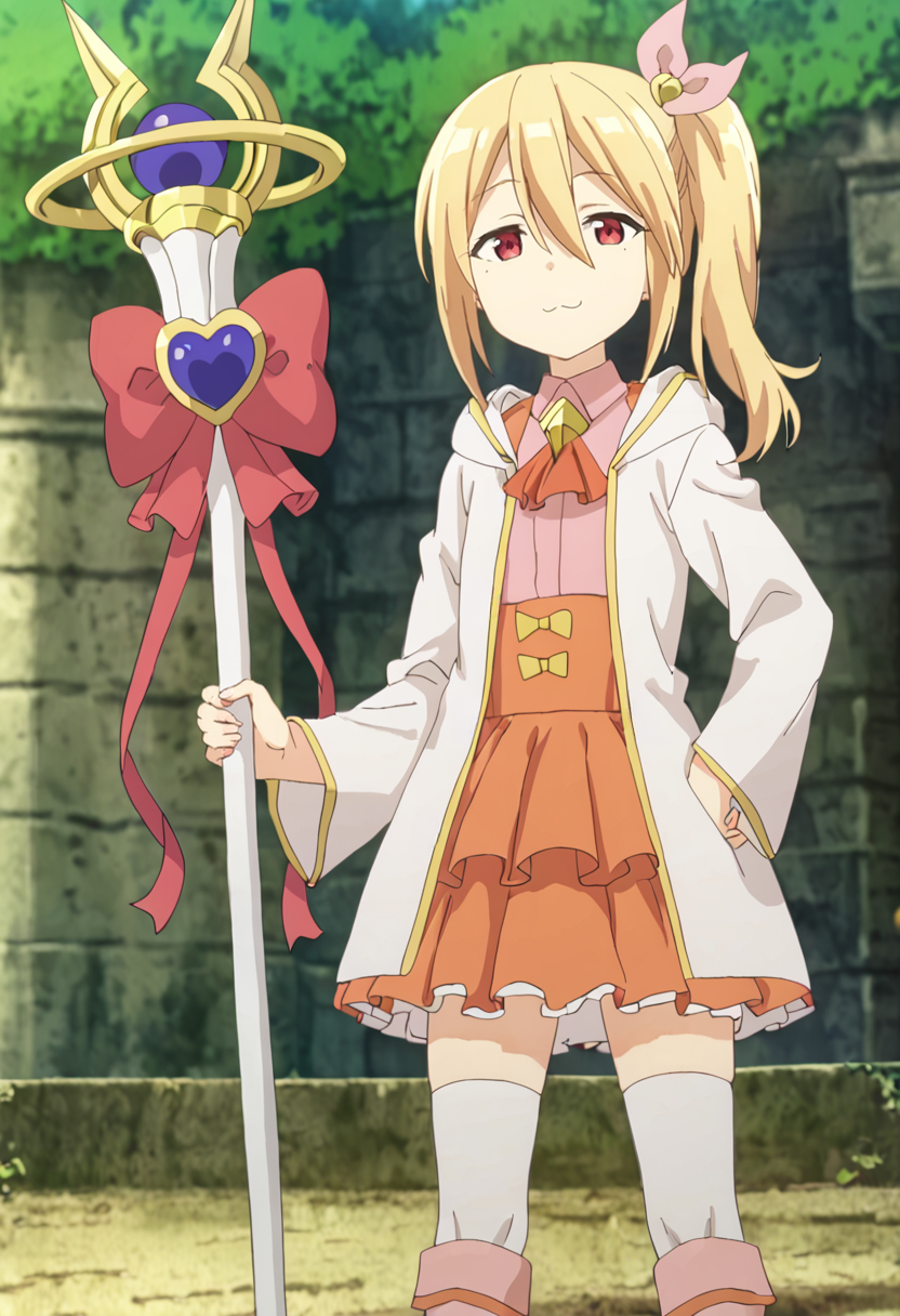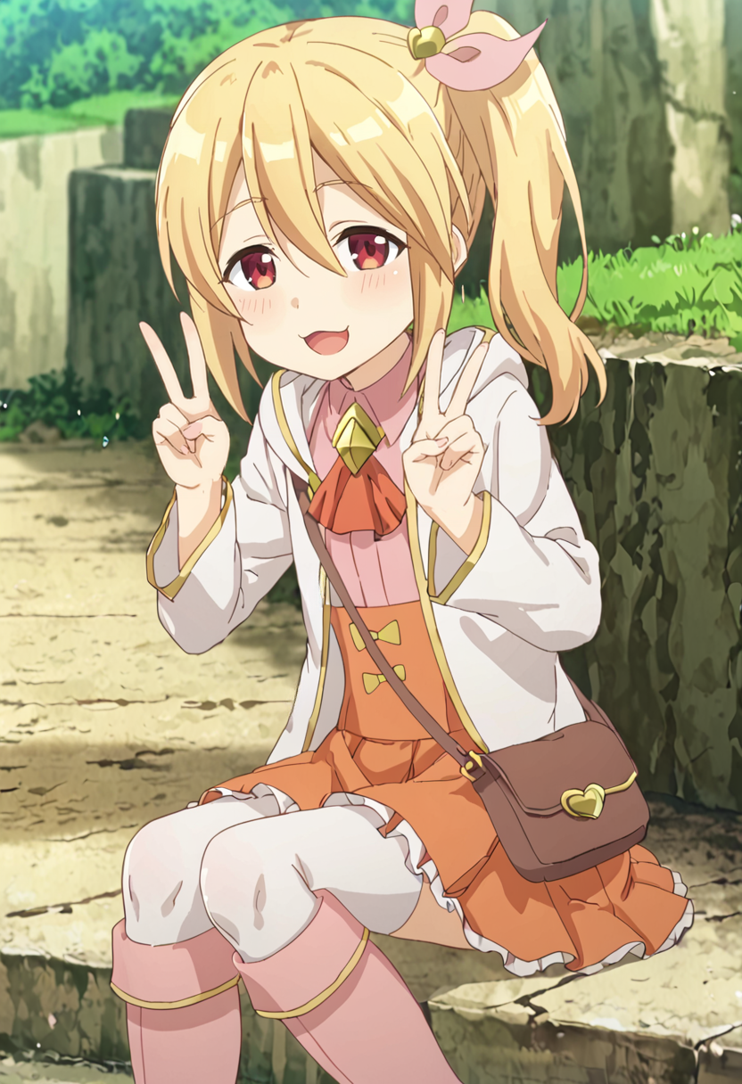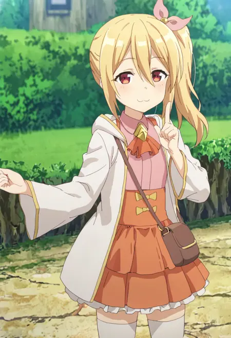 frederica-default,frederica \(bofuri\),red eyes,blonde hair, side ponytail, hair ribbon, white hoodie,pink shirt,ascot,shoulder bag,orange skirt,frilled skirt, pink knee boots,white thighhighs