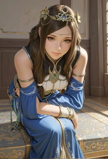 推荐正面提示:1girl, solo, long hair, brown hair, brown eyes, jewelry, hair ornament, tiara, dress, detached sleeves, pantyhose, high heels, blue footwear