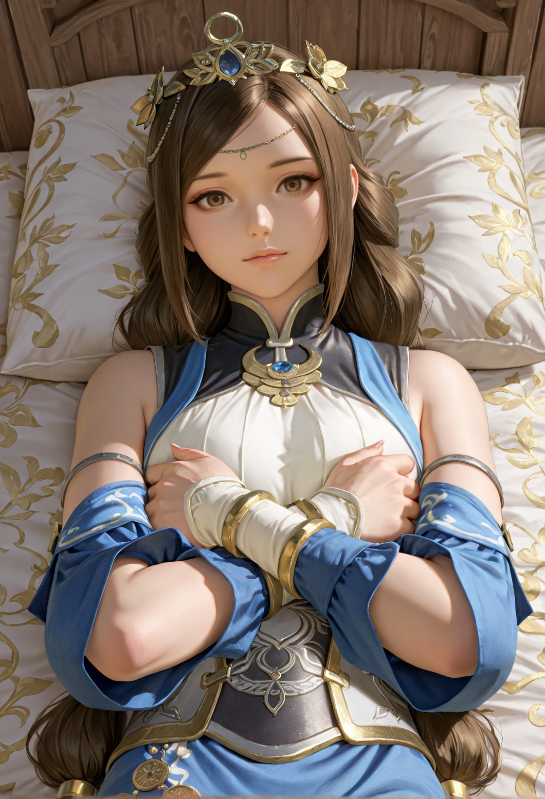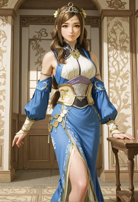 推荐正面提示:wenji, 1girl, solo, long hair, brown hair, hair ornament, detached sleeves, dress, brown eyes, jewelry, tiara