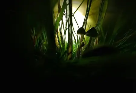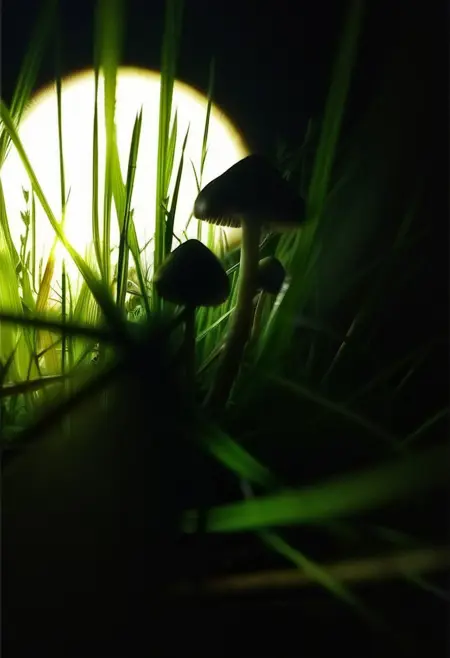 在生成的图像中添加长草和裸盖菇(Psilocybe semilanceata)的特写。擅长营造低调暗光效果,但也适用于较明亮的图像。