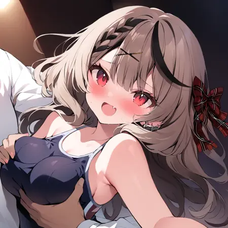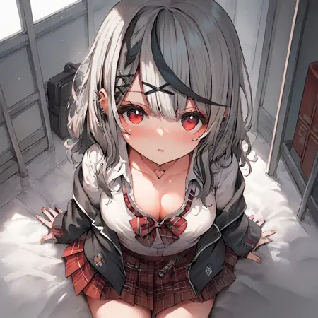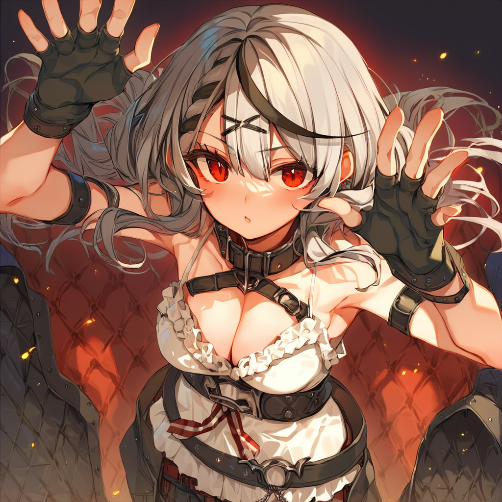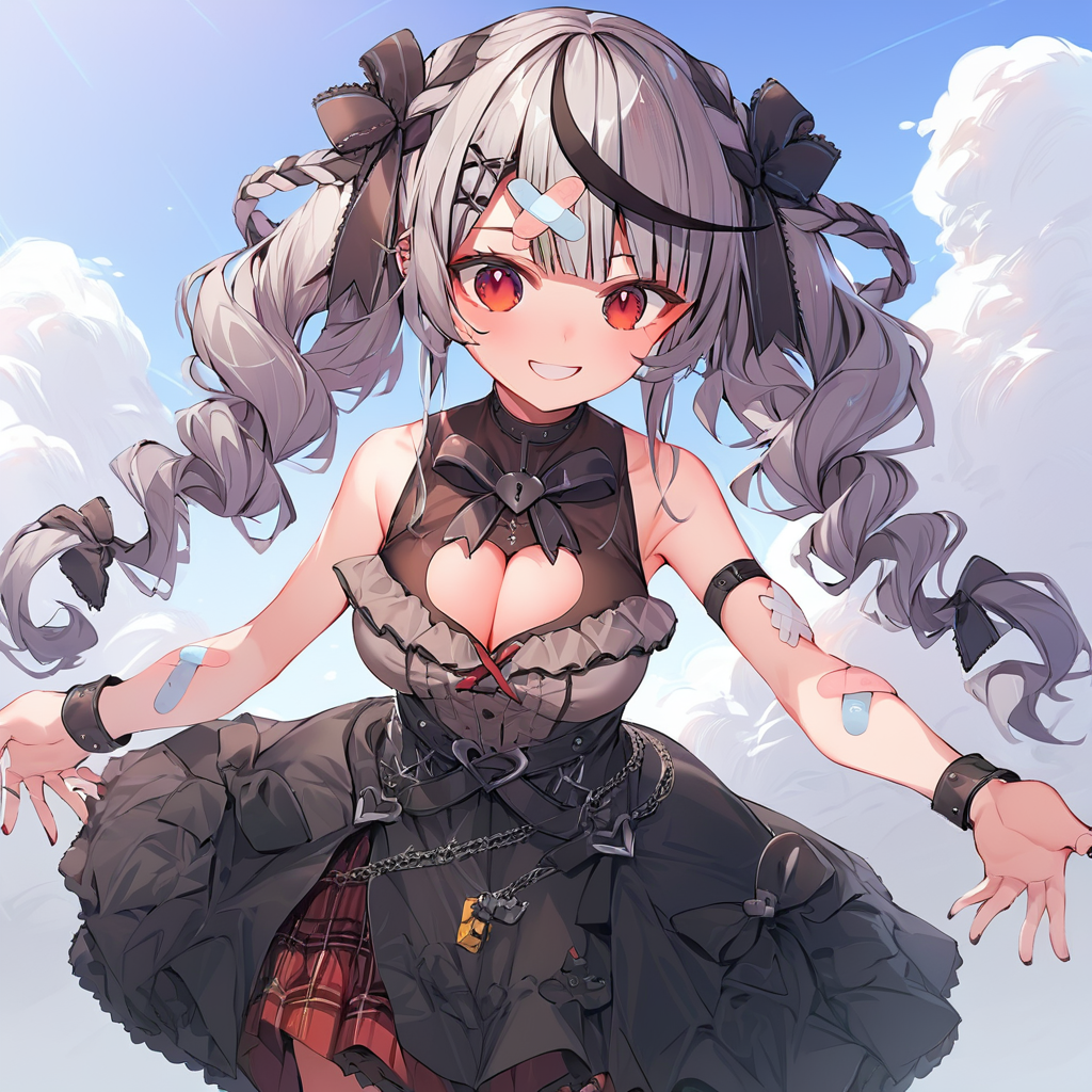 score_9, score_8_up, score_7_up, source_anime,sakamata chloe,sakamata_jirai,1girl,gray hair,red eyes ,cleavage,breasts,braid,twintail ,bandaid ,lora:Sakamata\_Chloe沙花叉クロヱhololiveVtuber:0.9