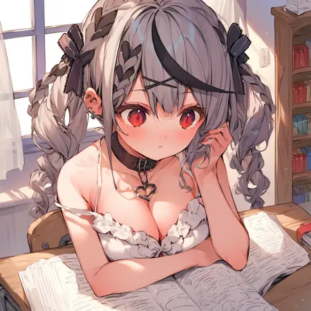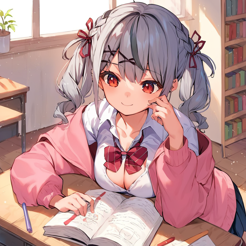 score_9, score_8_up, score_7_up, source_anime,sakamata chloe,sakamata_jk,1girl,gray hair,red eyes ,class room,class,desk,cleavage,breasts,study,braid,twintail lora:Sakamata\_Chloe沙花叉クロヱhololiveVtuber:0.9