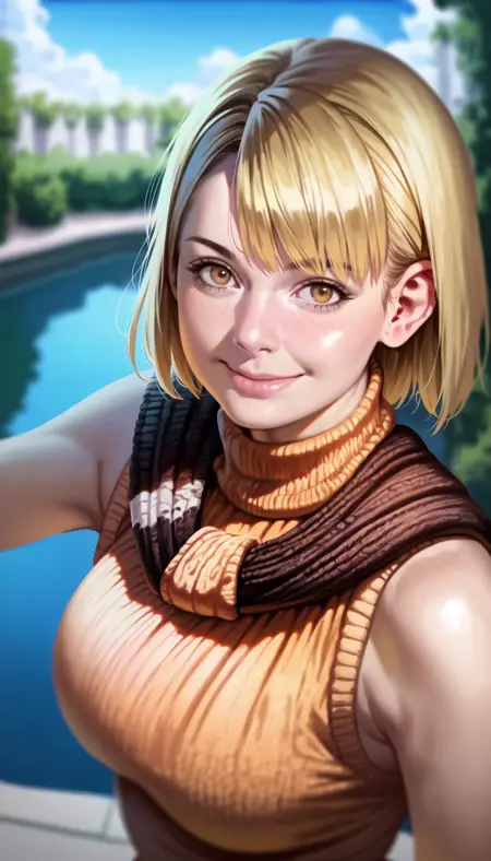 全身ショットでは、彼女の体のバランスにもわずかな問題があります。また、「肩に茶色のセーター、ノースリーブ」というタグが過剰適合しており、削除が非常に困難です。