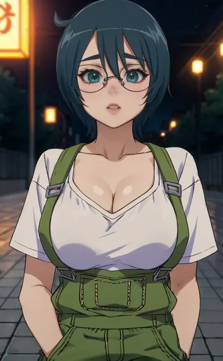 1girl, glasses, short hair, blue hair, green eyes,  blue eyes,  breasts, rimless eyewear, medium breasts,