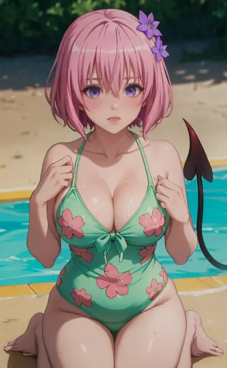 1girl, momo velia deviluke, pink hair, short hair, purple eyes, hair ornament, dress, casual one-piece swimsuit, demon tail, flower, bikini, tail, floral print, hair flower, one-piece swimsuit, ;d, lala satalin deviluke, sundress, twintails,