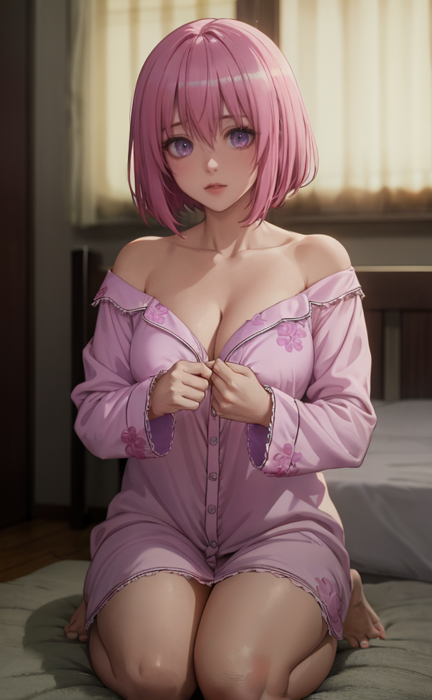 1girl, short hair, purple eyes, pink hair, momo velia deviluke, pajamas, medium breasts, open clothes, nipples, off shoulder, bare shoulders, collarbone, no bra, open shirt, demon tail, navel, cleavage, underwear, white panties, bottomless, bow panties, nude, pov, undressing, areola slip, breasts, brown hair, girl on top, large breasts, naked shirt, akaza akari, constricted pupils, cowgirl position, dress shirt, flat chest, hair between eyes, hanging breasts, nipple slip,