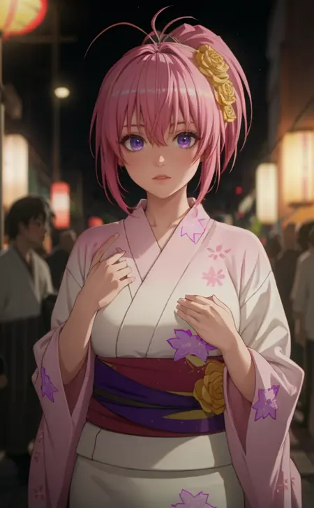 1girl, pink hair, purple eyes, short hair, japanese clothes, yukata, hair ornament, kimono, hair flower, ponytail, momo velia deviluke, alternate hairstyle, floral print, pink kimono, yellow flower, twintails, yellow rose, flower, bangs, demon tail, kaname madoka, sandals, sash, white kimono, antenna hair, hair between eyes, obi, akaza akari, blonde hair, cat, cleavage, downblouse, empty eyes, gotou hitori, hair over one eye, hair twirling, komeiji satori, long hair,