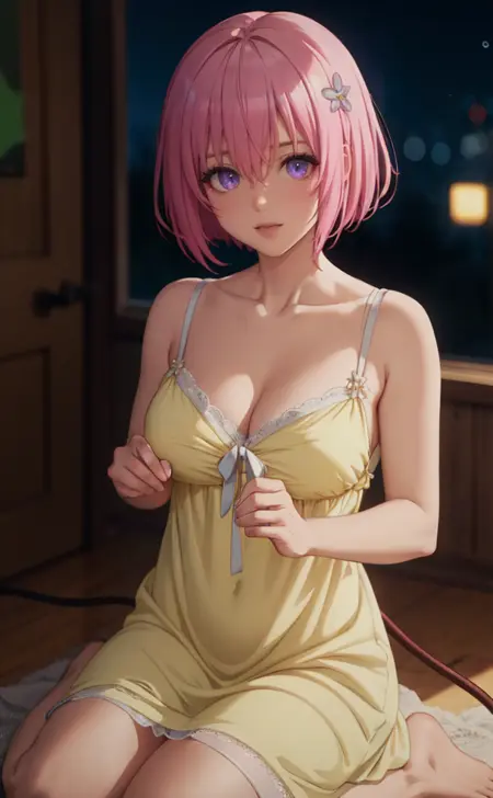 1girl, short hair, pink hair, momo velia deviluke, purple eyes, hair ornament, hair flower, cleavage, dress, medium breasts, demon tail, breasts, collarbone, flower, yellow dress, bangs, bra, hair between eyes, hairclip, nightgown, sandals, school uniform, sleeveless dress, underwear, white dress,