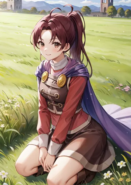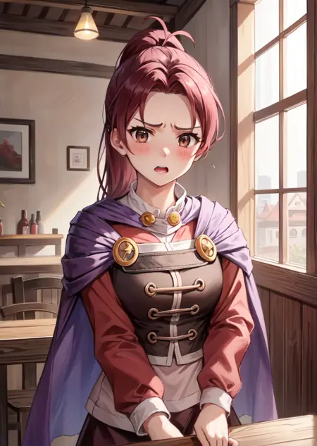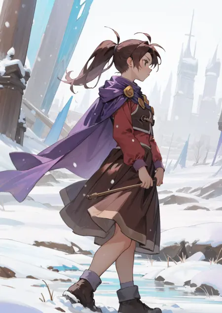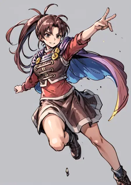 전형적인 모습을 위해 "원피 테일, 보라색 망토, 빨간 셔츠, 조끼, 갈색 스커트, 신발"을 추가하세요.