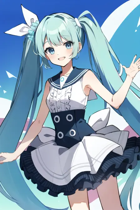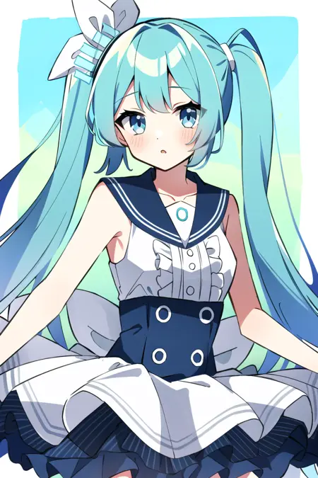 推荐提示词:buruaka miku,刘海,双马尾,水蓝色头发,发饰,极长的头发,蓝眼睛,荷叶边,无袖,水手领,无袖上衣,裙子