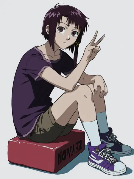 iwakura lain ps, t-shirt, shorts, white socks, purple sneakers