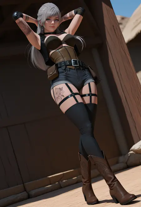 - アシンメトリー髪、ハーフアップ、イヤリング、ベルトカラー、クロップベスト、ストラップレスブラ、コルセット、ルーズベルト、ベルトポーチ、デニムショーツ、ガーター straps、太ももストラップ、シースルータイツ、エルボーパッド、アームタトゥ、ハンドタトゥ、レッグタトゥ、
