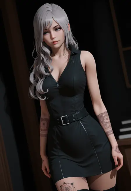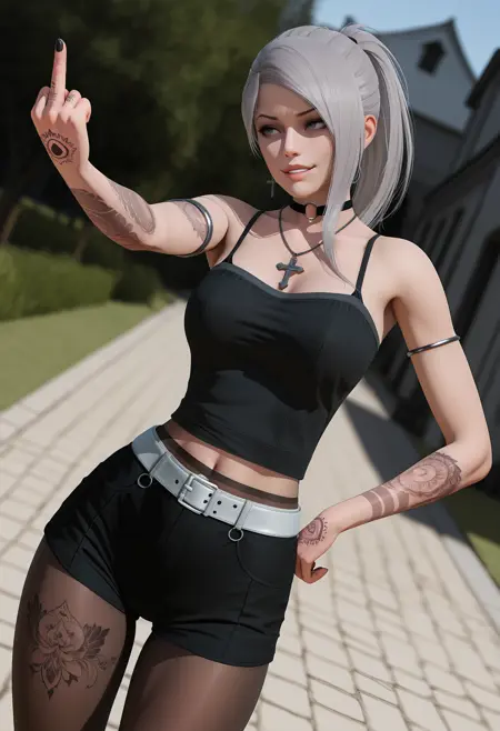 - アシンメトリー髪、ポニーテール、Oリングチョーカー、クロスネックレス、ブラックカミソール、お腹の肌見せ、ショーツの下にタイツ、白いベルト、ブラックショーツ、アームレット、アームタトゥ、ハンドタトゥ、レッグタトゥ、