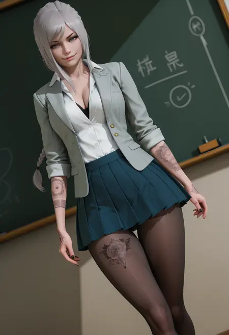- アシンメトリー髪、編み込みポニーテール、スクールユニフォーム、グレージャケット、オープンジャケット、袖をまくった状態、白シャツ、ブラの見え具合、青スカート、プリーツスカート、タイツ、アームタトゥ、ハンドタトゥ、レッグタトゥ、