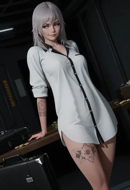 - 髪を下ろしたスタイル、ノースリーブシャツ、カラー付きシャツ、ロングシャツ、白シャツ、黒縁取り、袖をまくった状態、アームタトゥ、ハンドタトゥ、レッグタトゥ、