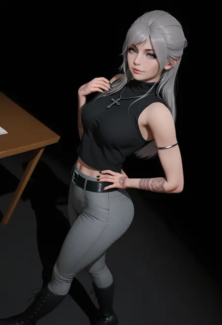 - アシンメトリー髪、ハーフアップ、クロスネックレス、ノースリーブタートルネック、ブラックシャツ、お腹の肌見せ、ブラックベルト、グレーパンツ、レースアップブーツ、アームレット、アームタトゥ、ハンドタトゥ、