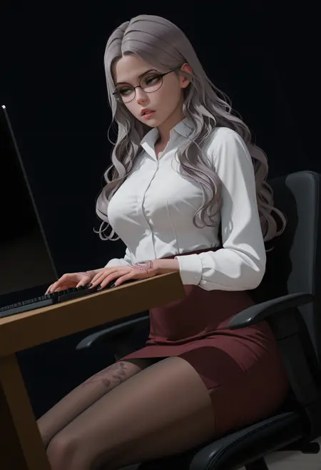 - センターパート、ウェービー髪、オフィスレディ、眼鏡、ドレッシーシャツ、白シャツ、ロングスリーブ、赤スカート、ハイウエストスカート、タイツ、ハンドタトゥ、レッグタトゥ、