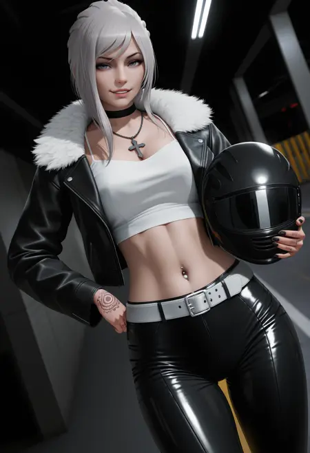 不对称发型,编发马尾,黑色项圈,十字项链,皮夹克,敞开式夹克,毛皮镶边,白色背心,露脐装,肚脐环,白色腰带,皮裤,手部纹身,