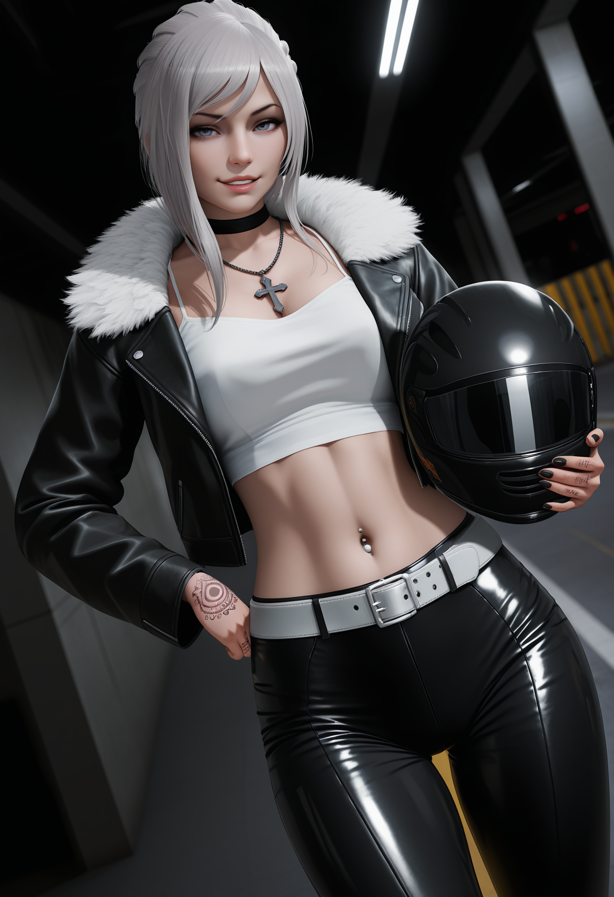 - アシンメトリー髪、編み込みポニーテール、ブラックチョーカー、クロスネックレス、レザージャケット、オープンジャケット、ファー縁取り、白いカミソール、クロップトップ、へそリング、白いベルト、レザーパンツ、ハンドタトゥ、