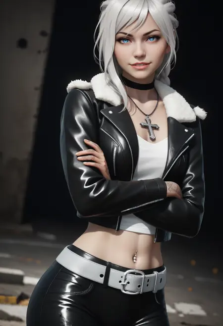 不对称发型,编发马尾,黑色项圈,十字项链,皮夹克,敞开式夹克,毛皮镶边,白色背心,露脐装,肚脐环,白色腰带,皮裤,手部纹身,