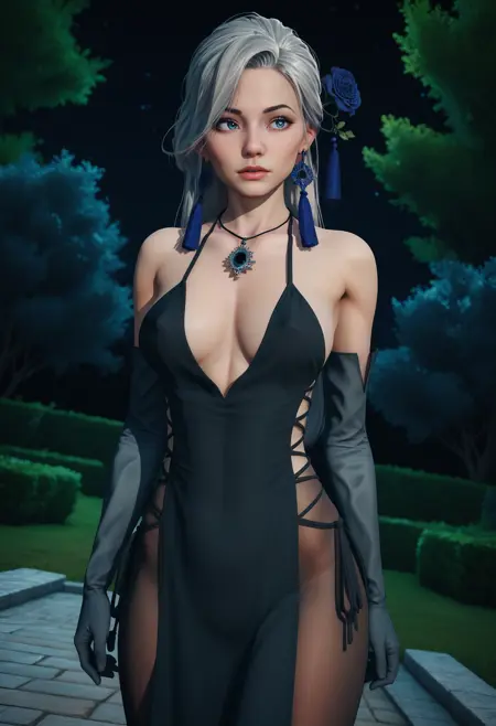 半盘发,发饰花,流苏耳环,项链,吊坠,晚礼服,黑色连衣裙,侧开衩,交叉系带开衩,骨盆帘幕,黑色丝袜,肘部手套,
