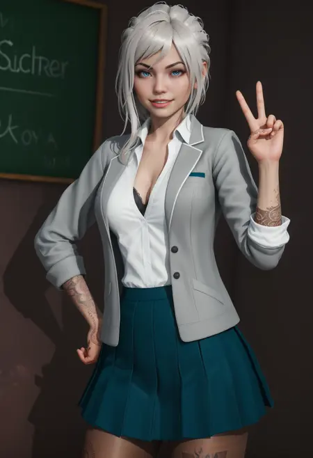 不对称发型,编发马尾,校服,灰色夹克,敞开式夹克,袖子卷起,白衬衫,内衣若隐若现,蓝色裙子,百褶裙,丝袜,手臂纹身,手部纹身,腿部纹身,