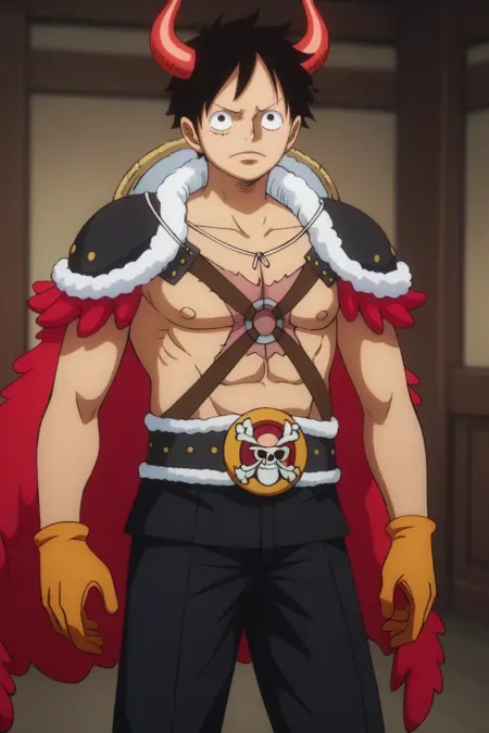 1.-luffy_or,黑发,黑眼,脸上有疤痕,红衬衫,蓝裤子,裤子卷起,帽子,