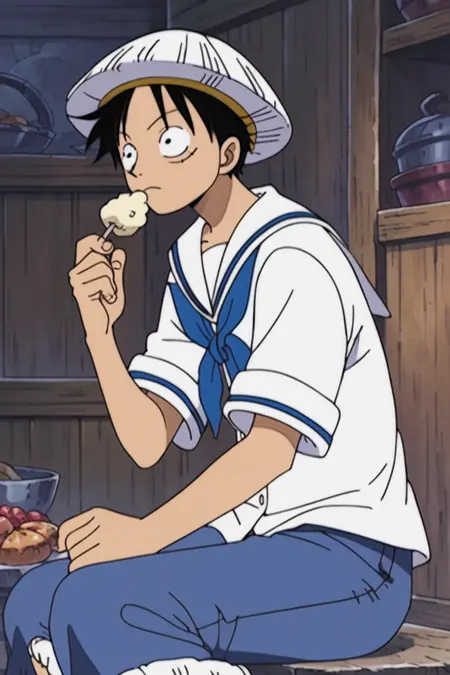 2.-luffy_ma,黑发,黑眼,脸上有疤痕,白衬衫,白帽子,蓝色围巾,水手领,蓝裤子,裤子卷起,