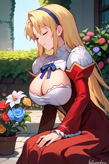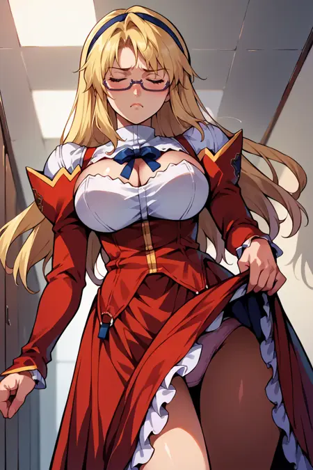 添加“发带、红裙、露胸剪裁、蓝色丝带、红色袖子、分离袖子、褶边、长裙”以呈现她的典型造型。