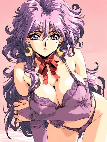 Leila(MP), 1girl, solo, large breasts, long hair, purple hair, jewelry, crescent earrings, purple eyes, oekaki,