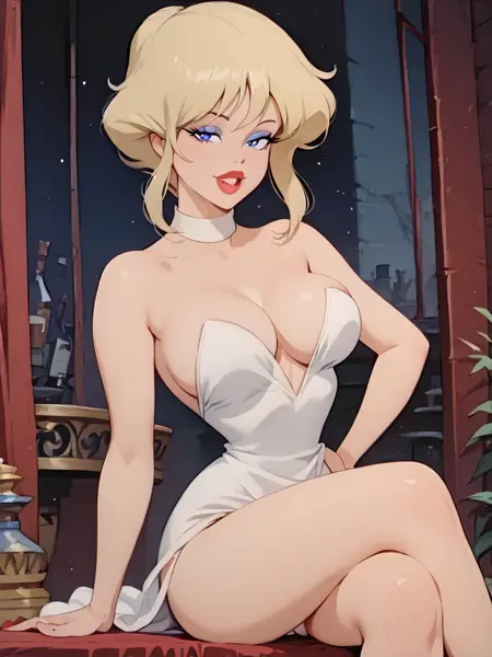 holliwould, 1girl, blonde hair, solo, makeup, lipstick, blue eyes, retro artstyle,medium breasts, looking at viewer, open mouth, short hair, 1980s (style), smile, large breasts, choker, eyeshadow, teeth,