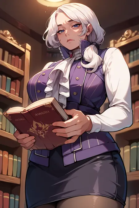 为呈现她的典型造型,请添加“高领、紫色背心、白衬衫、领结、长袖、黑裙、黑色丝袜”。