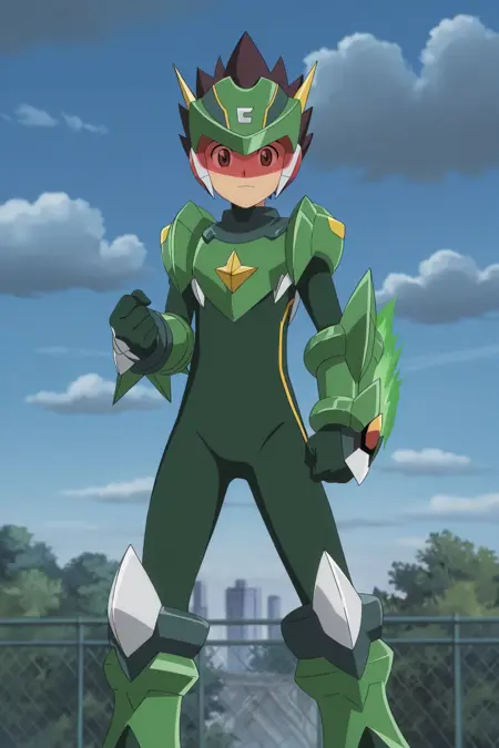 - force_da,棕色头发,棕色眼睛,绿色头盔,绿色紧身衣,绿色手套,有色眼镜,绿色靴子
