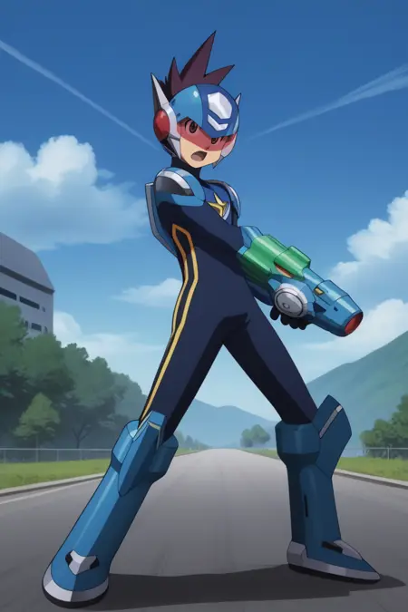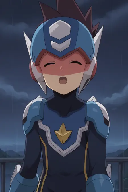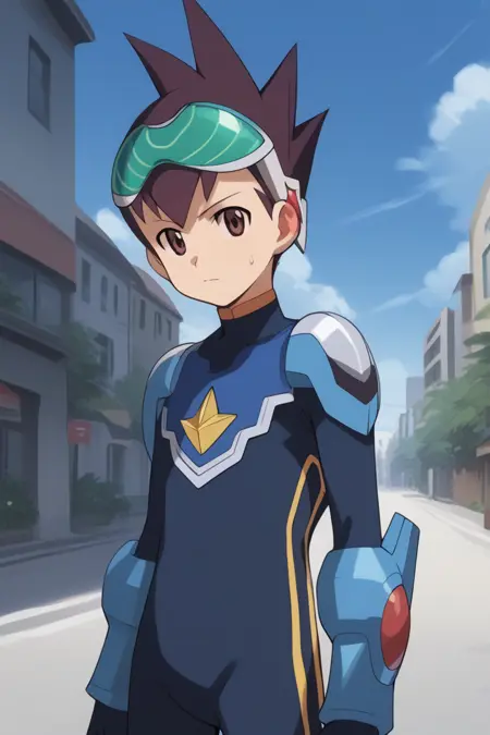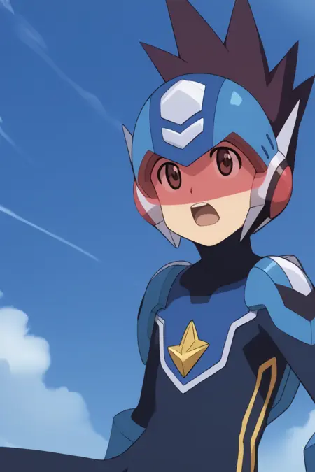 2.-star force, brown hair, brown eyes, blue bodysuit, blue helmet, blue gloves, blue boots