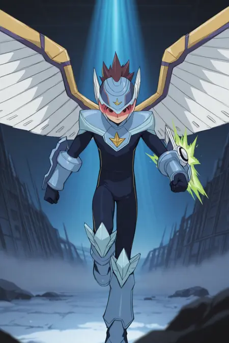 - force_pega,棕色头发,棕色眼睛,浅蓝色头盔,蓝色连体衣,浅蓝色手套,浅蓝色靴子,有色眼镜,机械翅膀,1