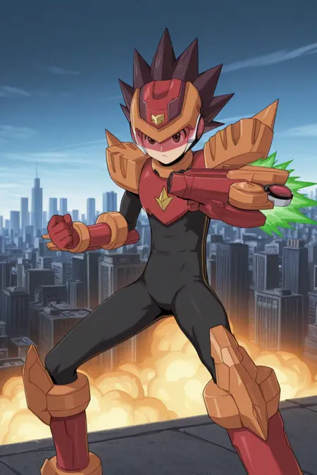geo_stelar,棕色头发,棕色眼睛,红色夹克,项链,红色无指手套,头戴护目镜,蓝色短裤,蓝色短裤,红色靴子